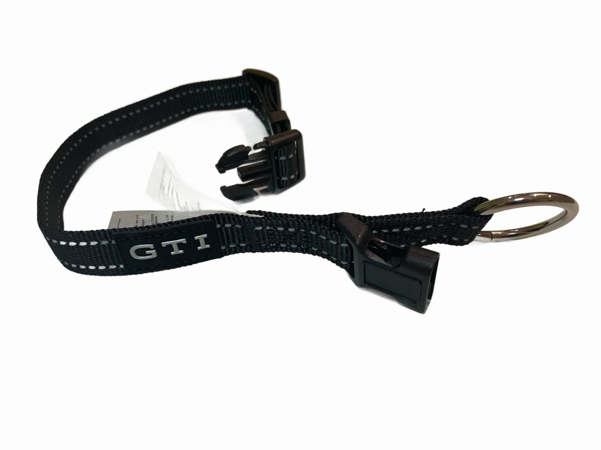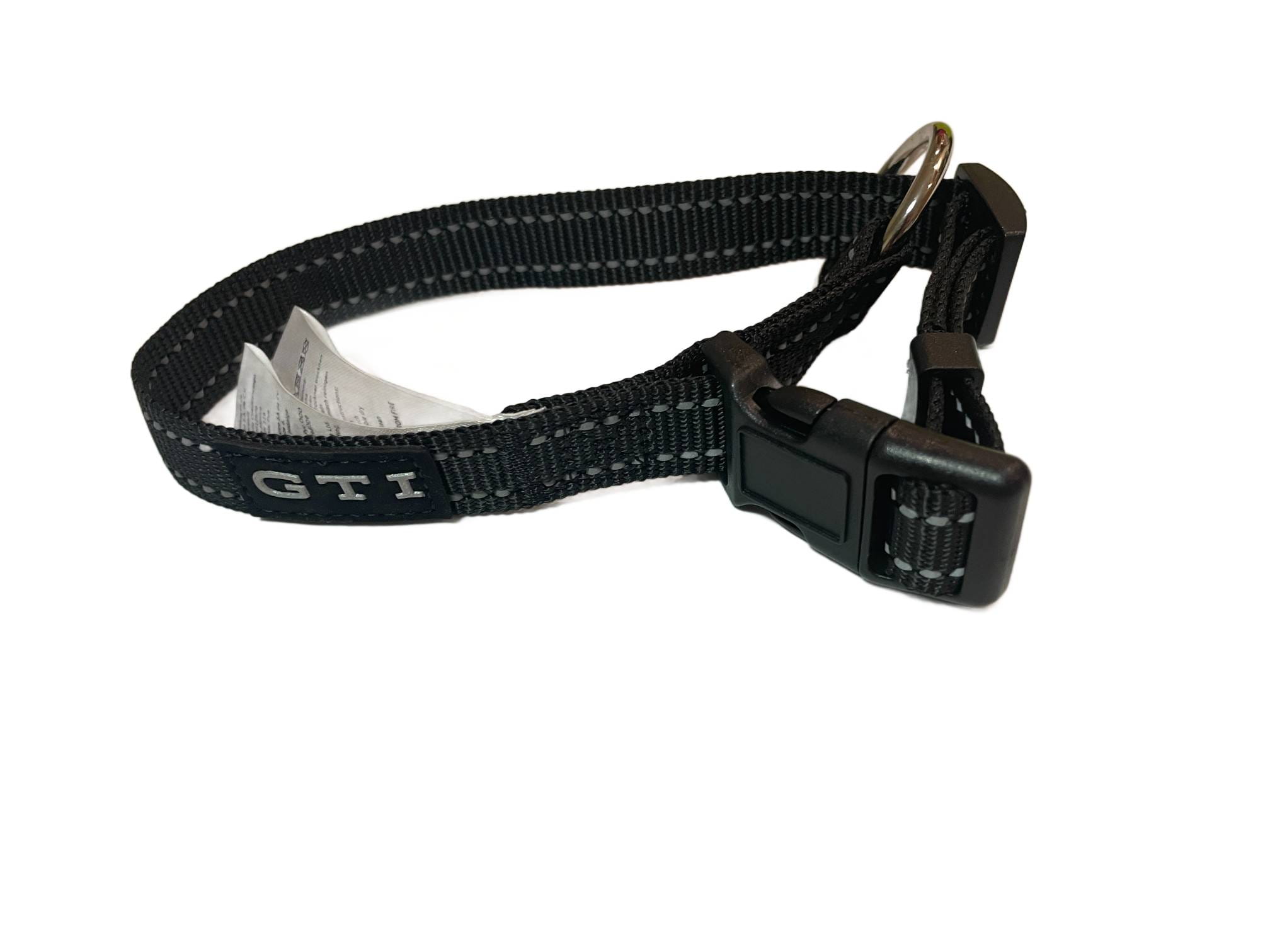 - Czarny z naszytą naszytą z odblaskowym logo GTI, z metalowym pierścieniem i klamrą z tworzywa sztucznego, z wszytym paskiem odblaskowym na całym obwodzie